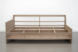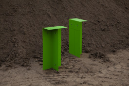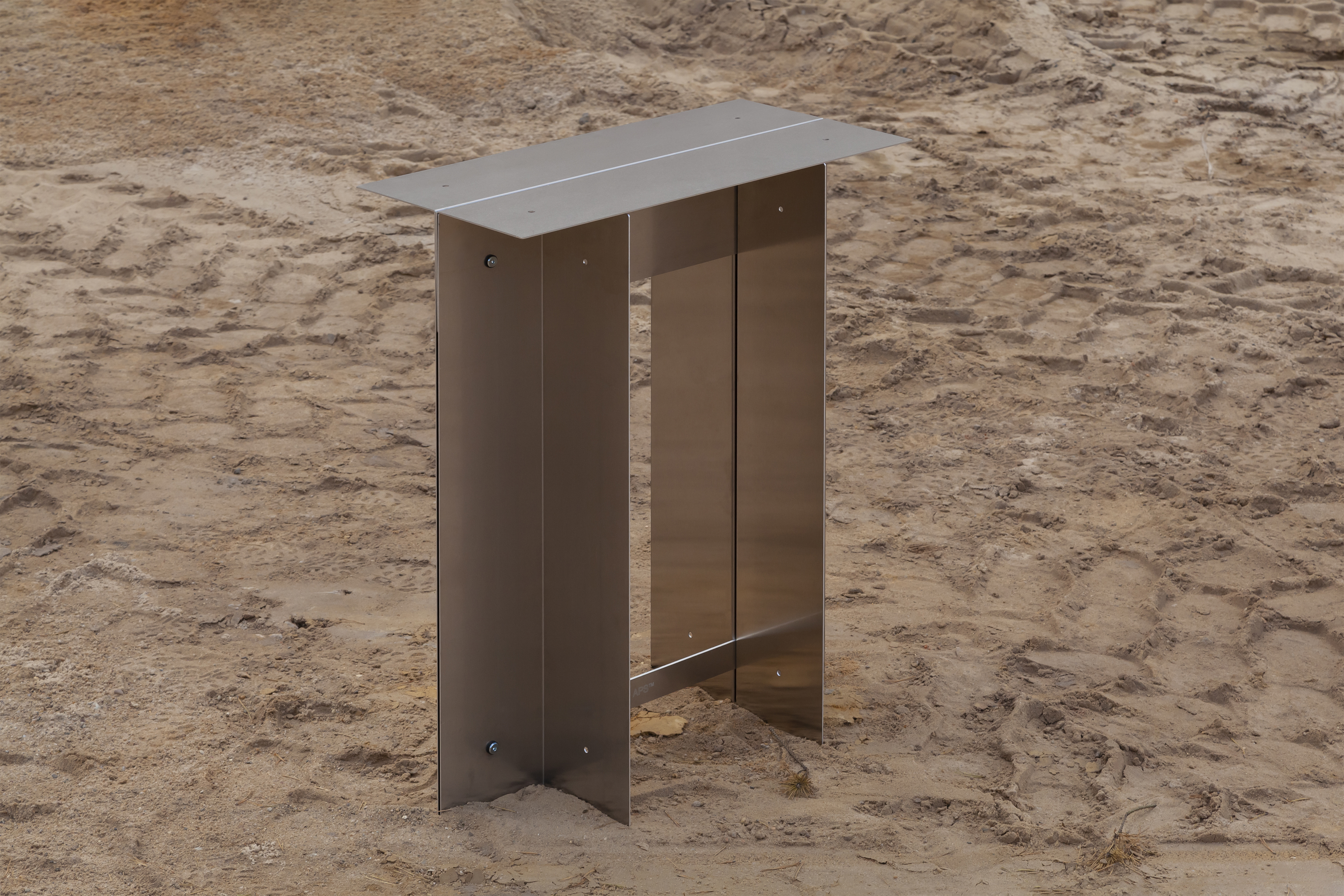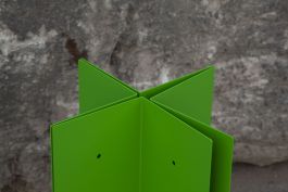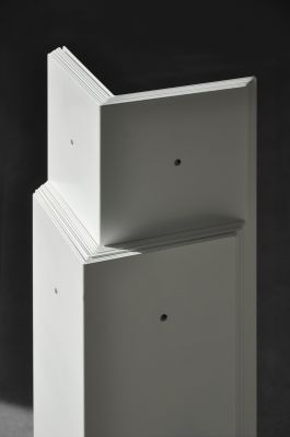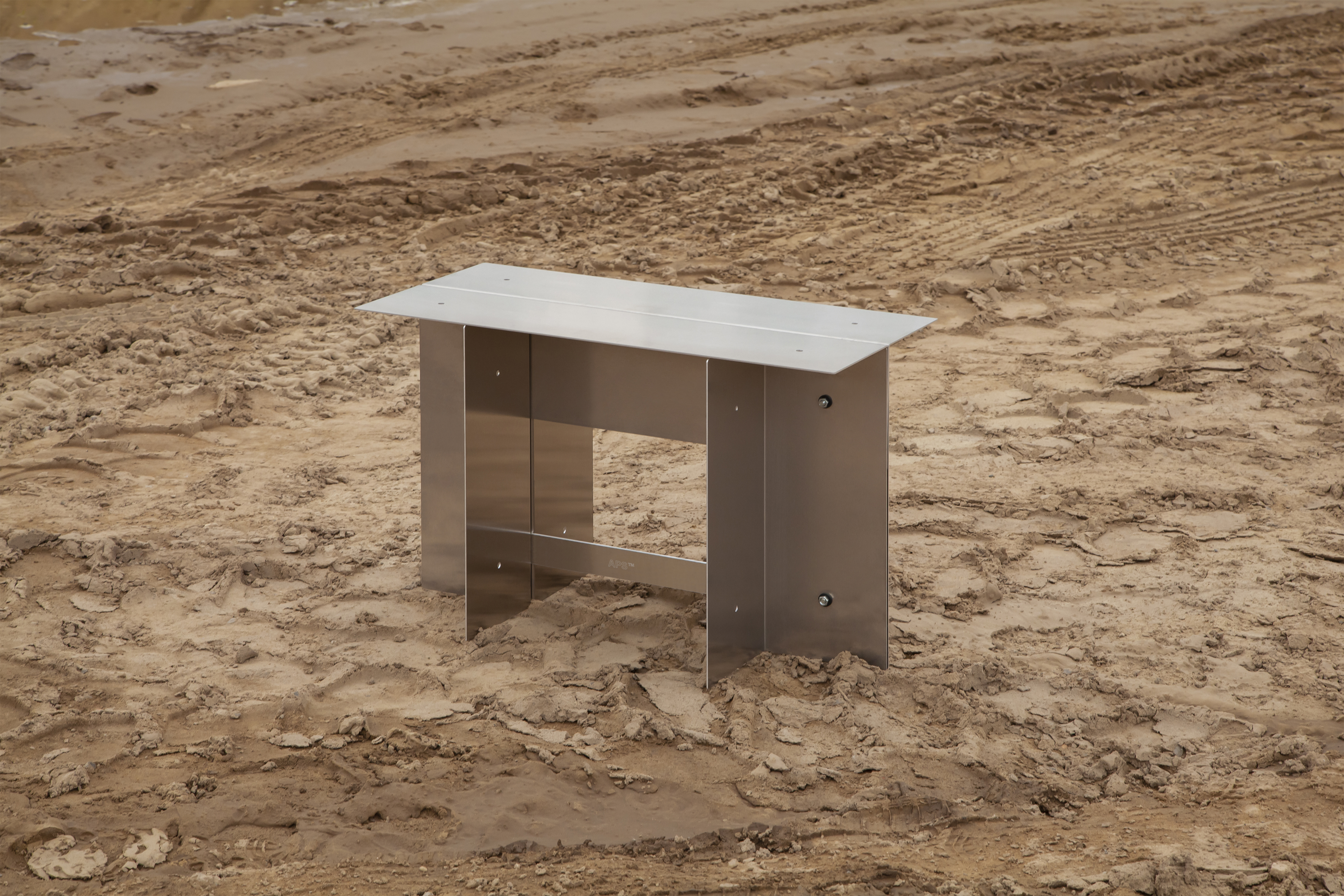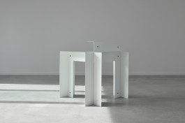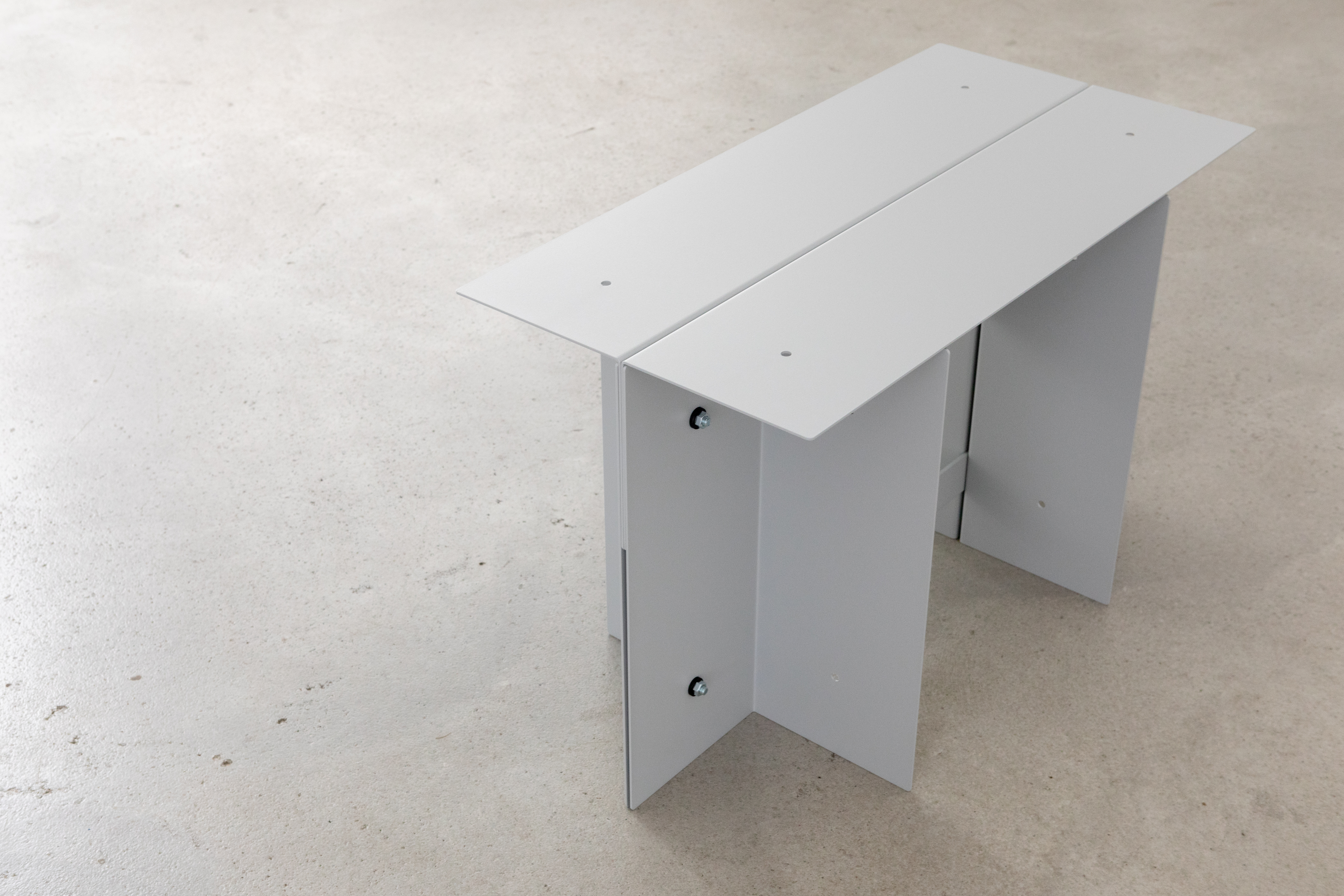It comprises 4 lengths of angled profiles, a low height (36cm), a seating height (46cm), a dining height (72cm) and a counter height (90cm). The strength of the system lies in its simple angular design which not only keeps production costs low but is also very efficient in storaging and transport. It allows for a hole spatial arrangement to be stored in less then 1 sqm.