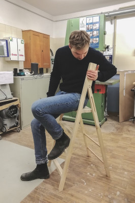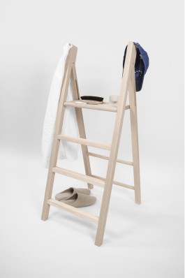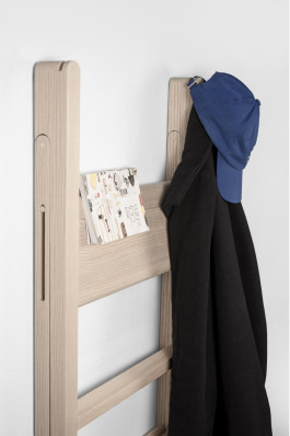 The ladder is an essential household item, but it is often rarely needed. The concept deals with the ladder‘s state of non-use, as well as its storage space referring to small apartments and households in general. The combination of several functions in one space-saving household furniture, as well as the use of wood as a warm natural material, aims to make the ladder an integral part of the furniture.