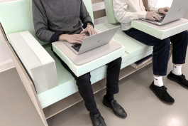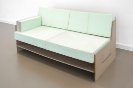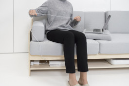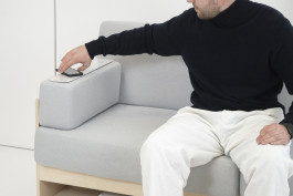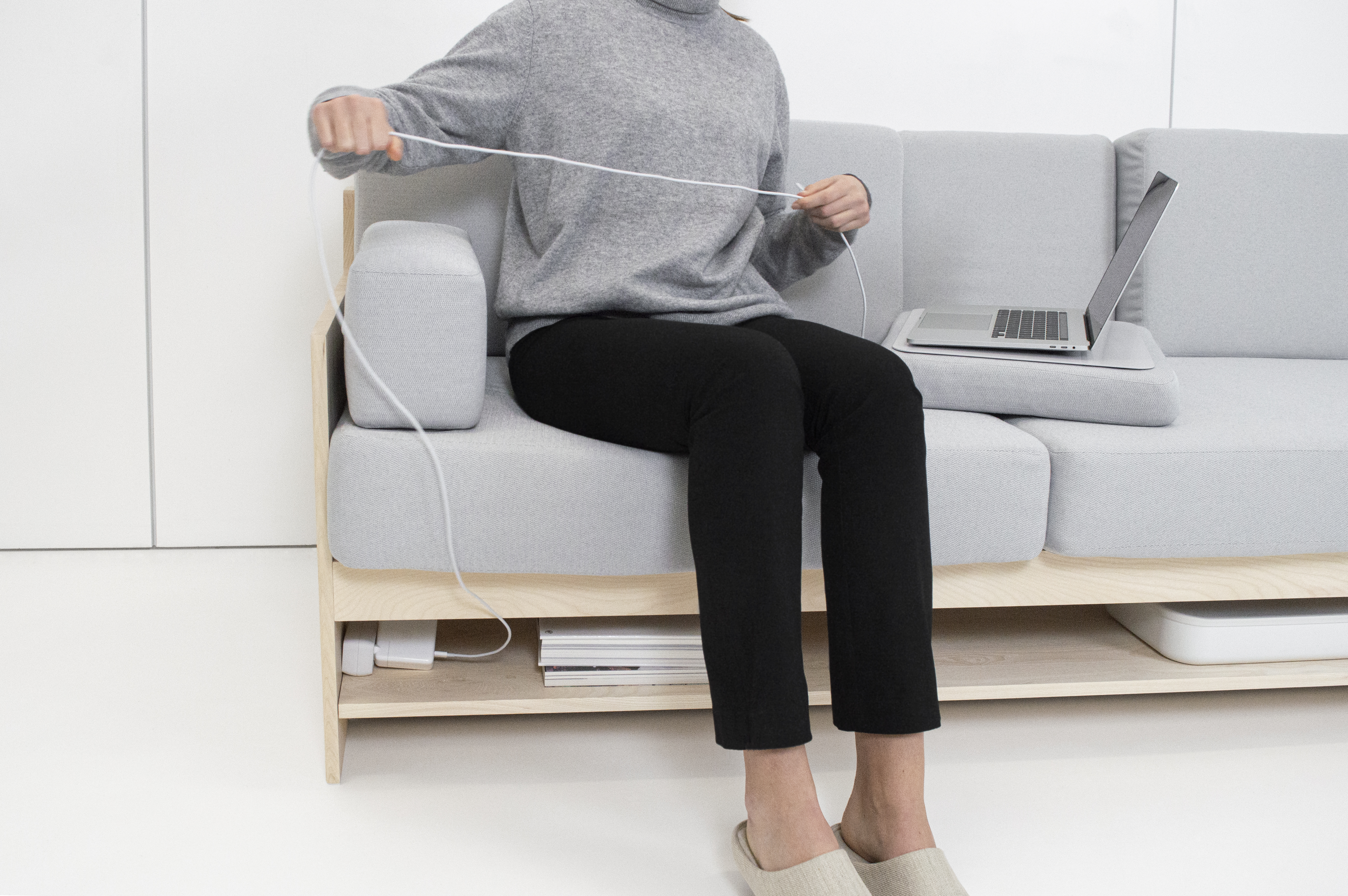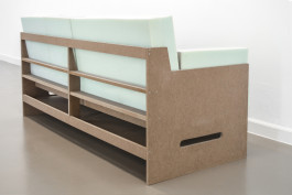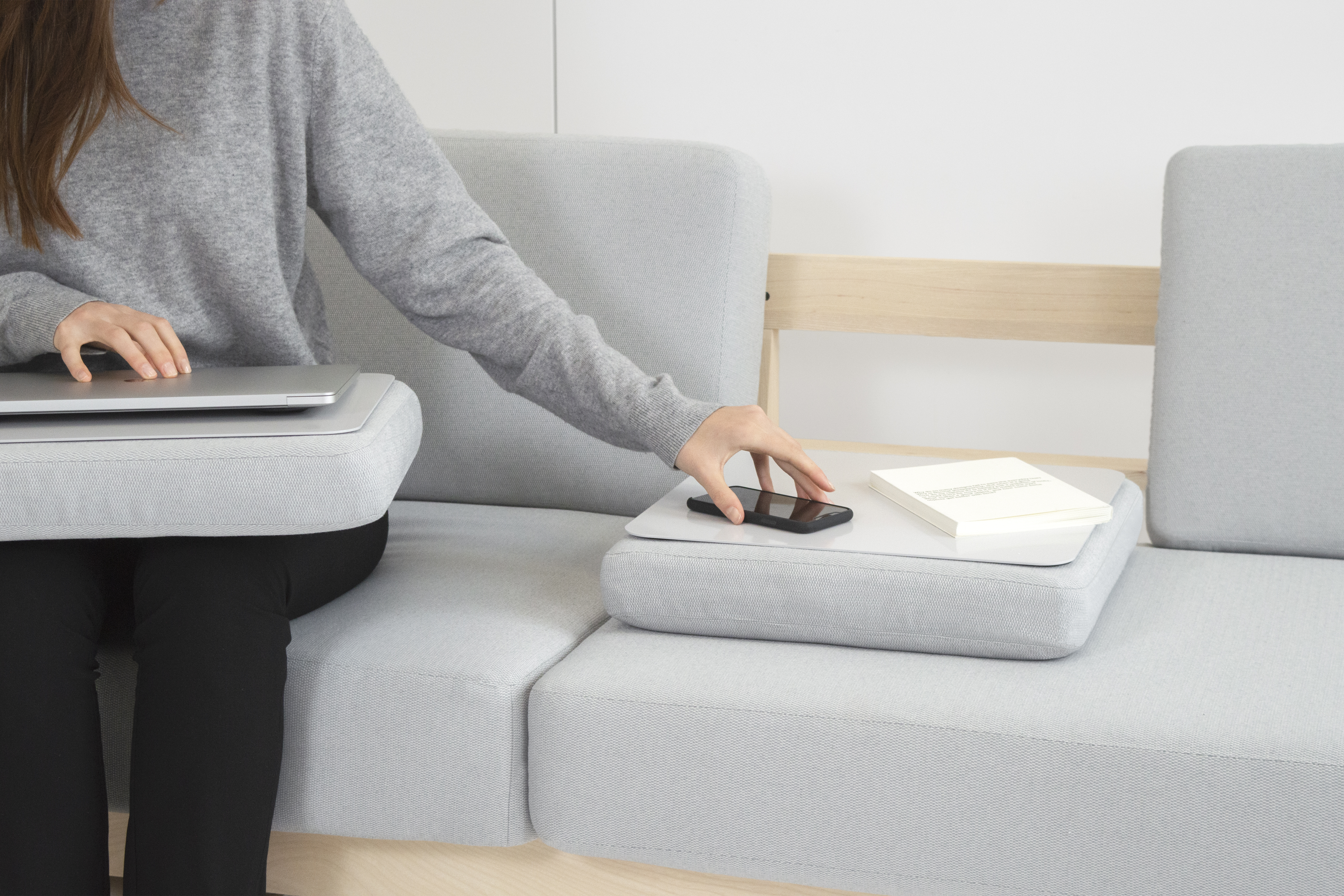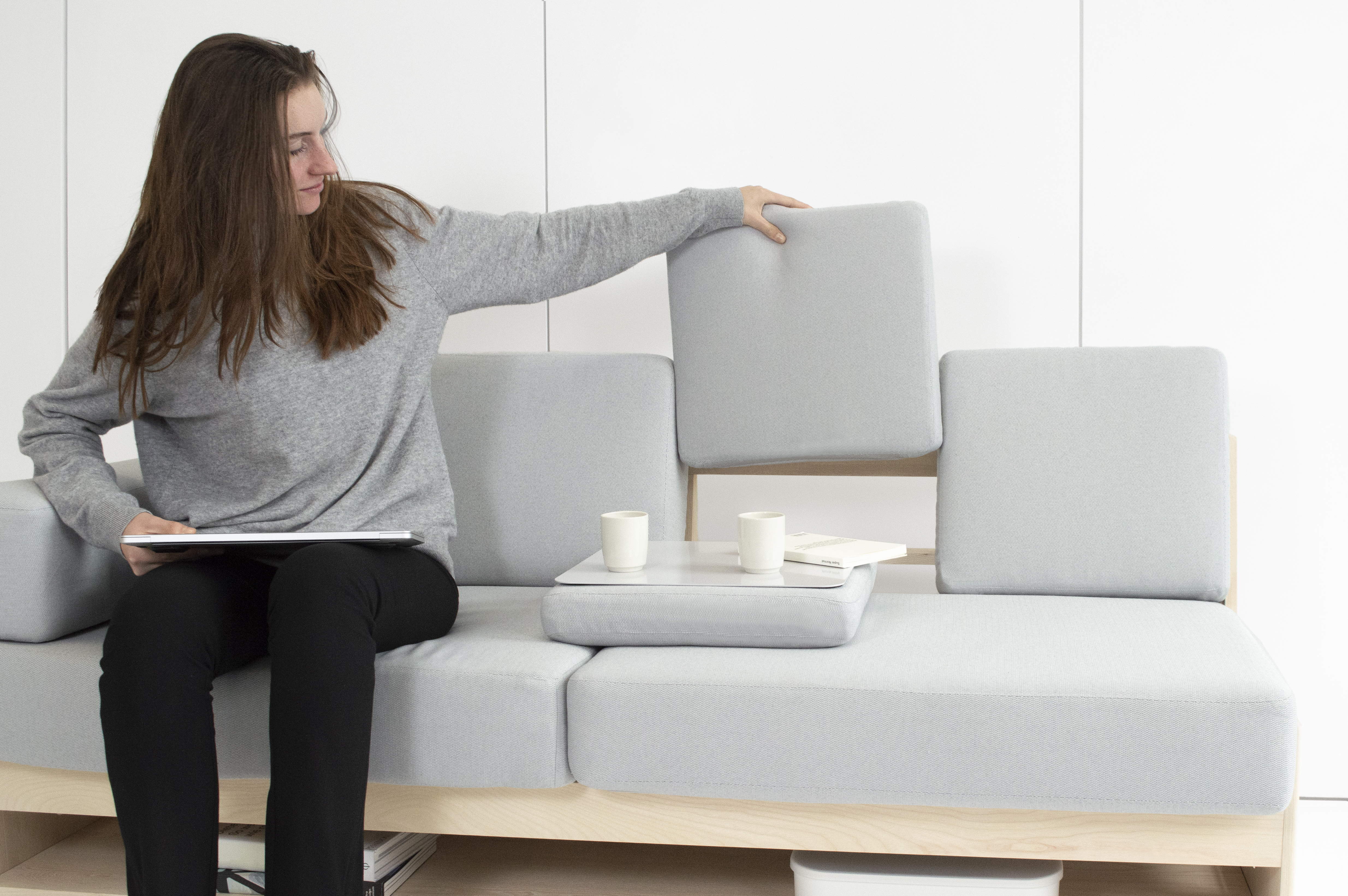 The sofa is emblematic for a change from the classic workplace to mobile working, fostered by the use of mobile digital devices. It forms the transition between sitting and lying down and becomes a hybrid between relaxing and working.