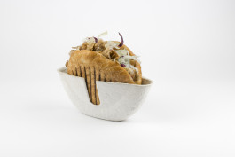 The DÖ kebab packaging is a disposable packaging for eating Döner kebab. It consists of eco-friendly and recyclable pulp, based on fiber moldings.